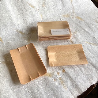 「木皿」は、そんな廃プラへの取り組みから、最近また注目されてきています。環境に優しいだけでなく、薄くて軽くて丈夫なので、行楽やパーティーなどで使用してみてはいかがでしょうか?懐紙を敷いて和菓子やお煎餅をのせて、お茶会などもお洒落です。基本的に使い捨てとなりますが、使い方によっては繰り返し使えそうです。