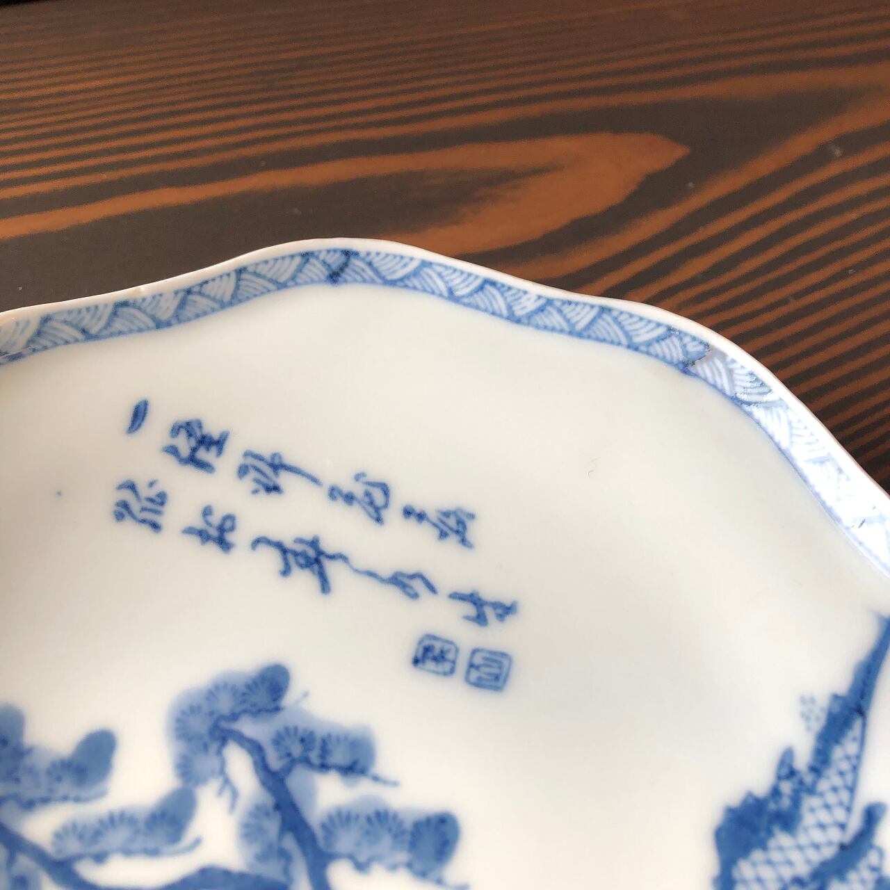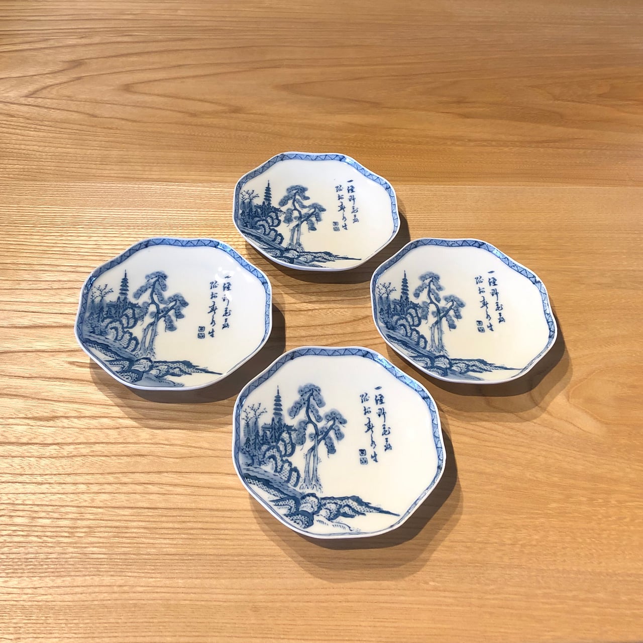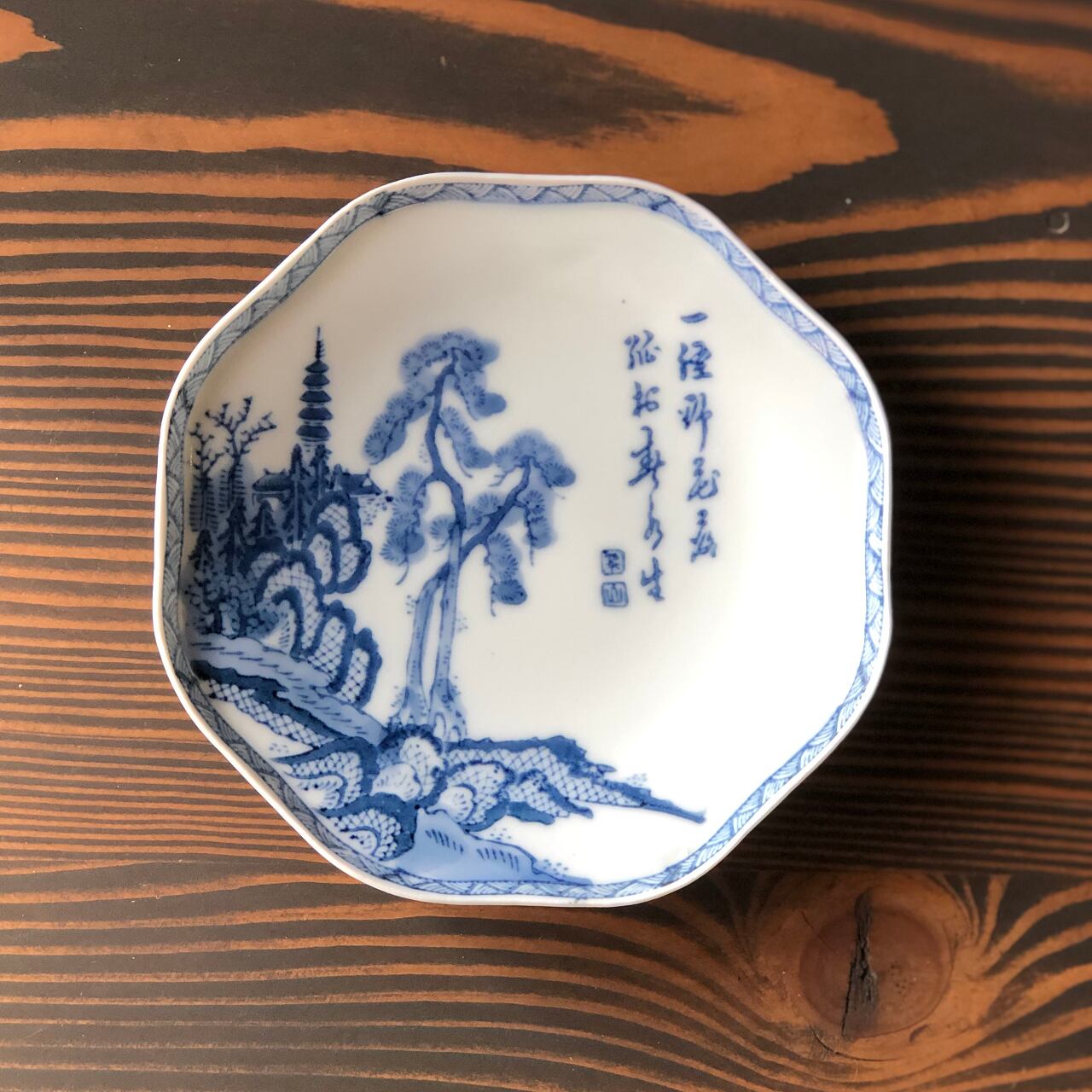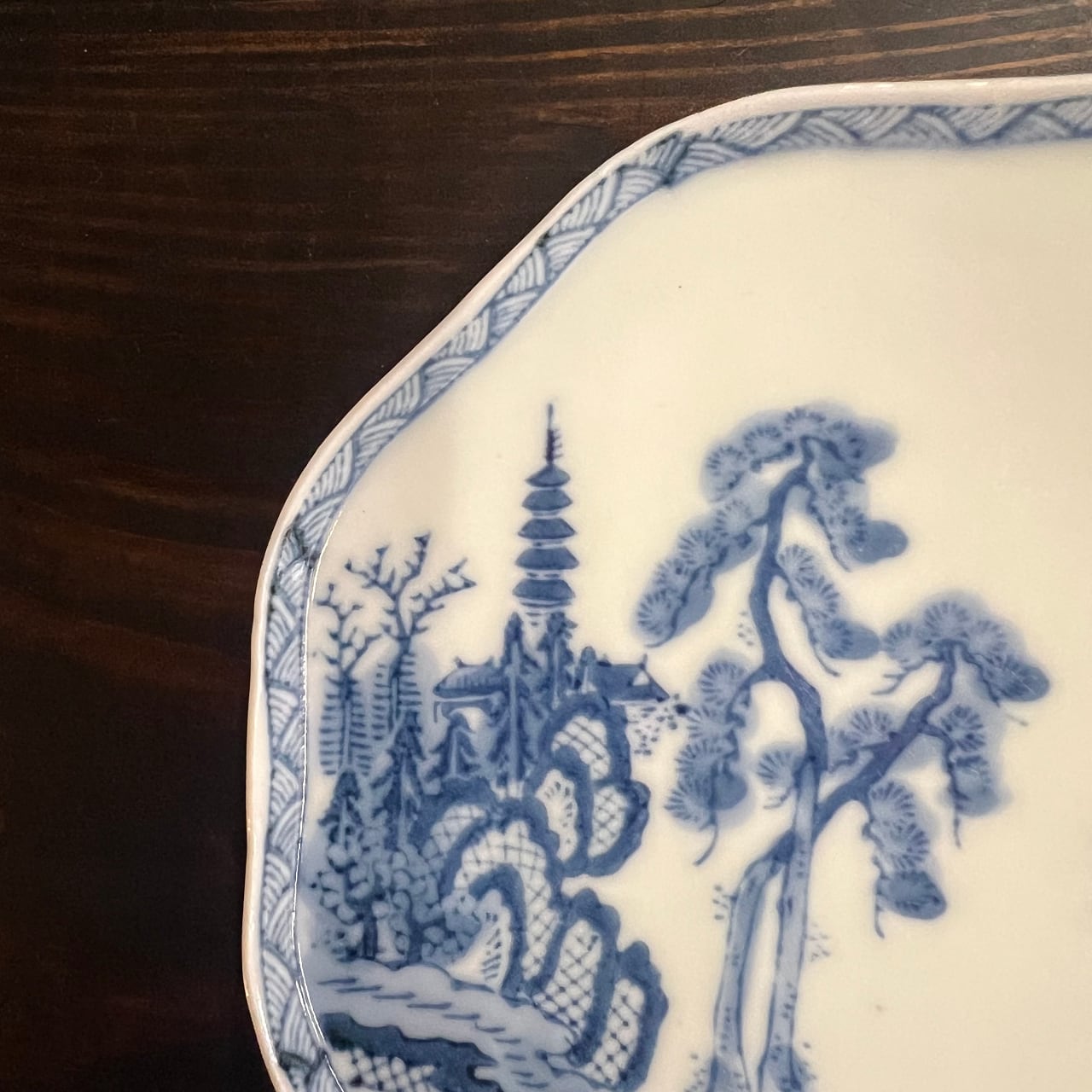 青い松と五重塔の風景画が美しい、八角形のアンティーク絵皿です。