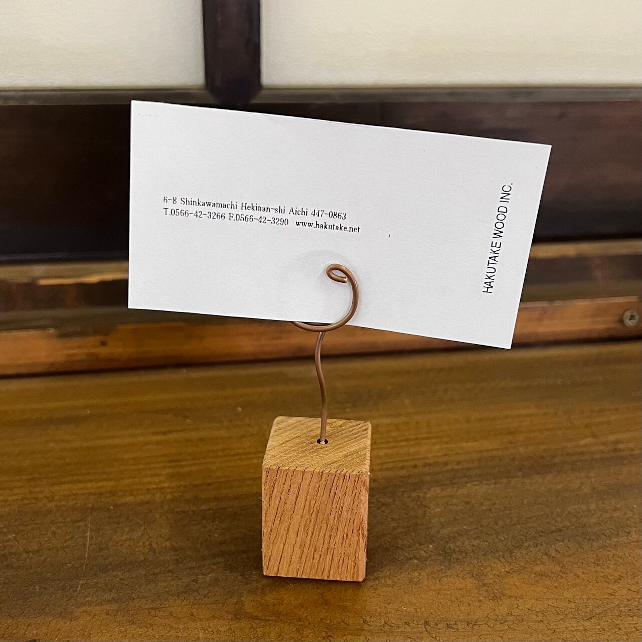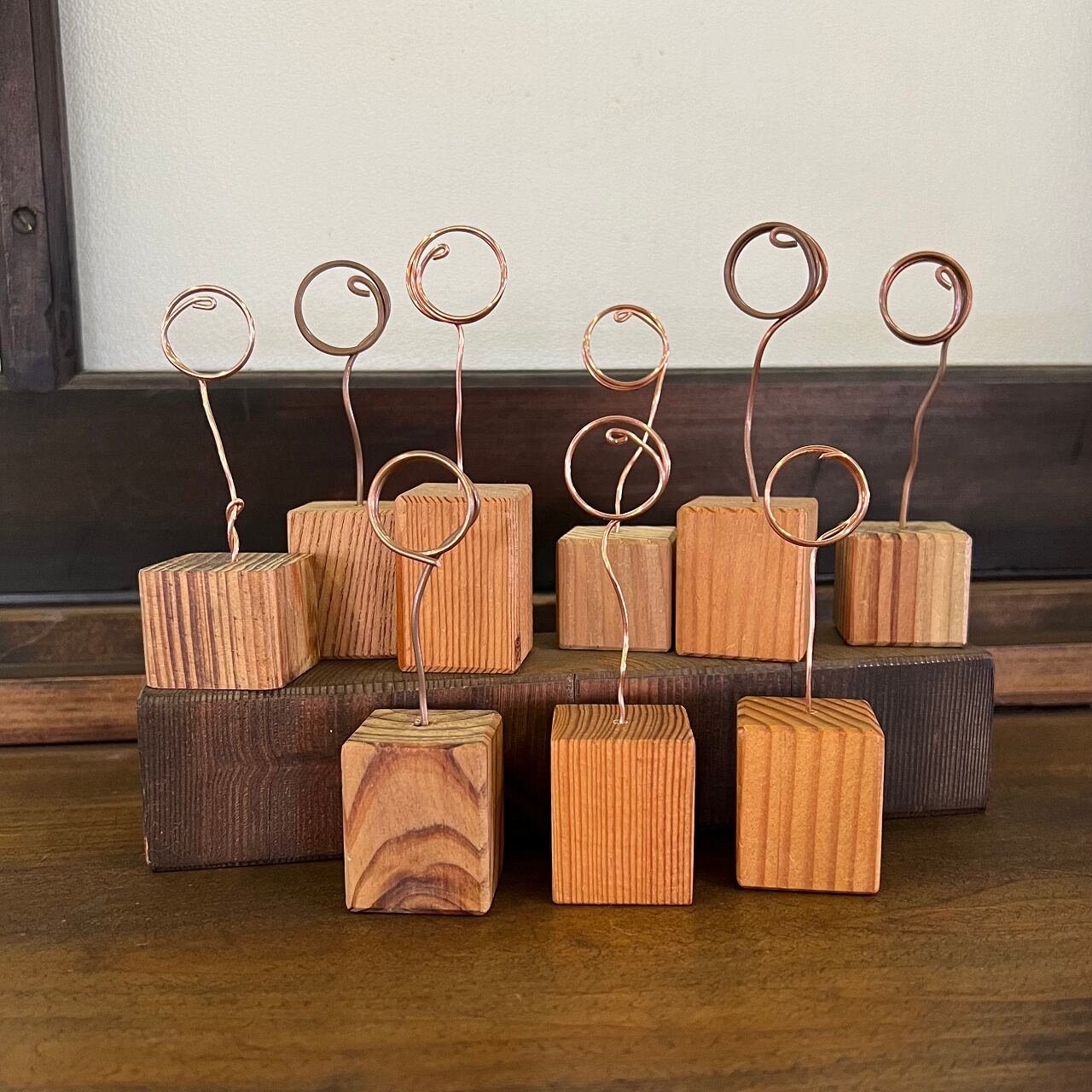 古材を利用して作ったワイヤーカードスタンドです。
